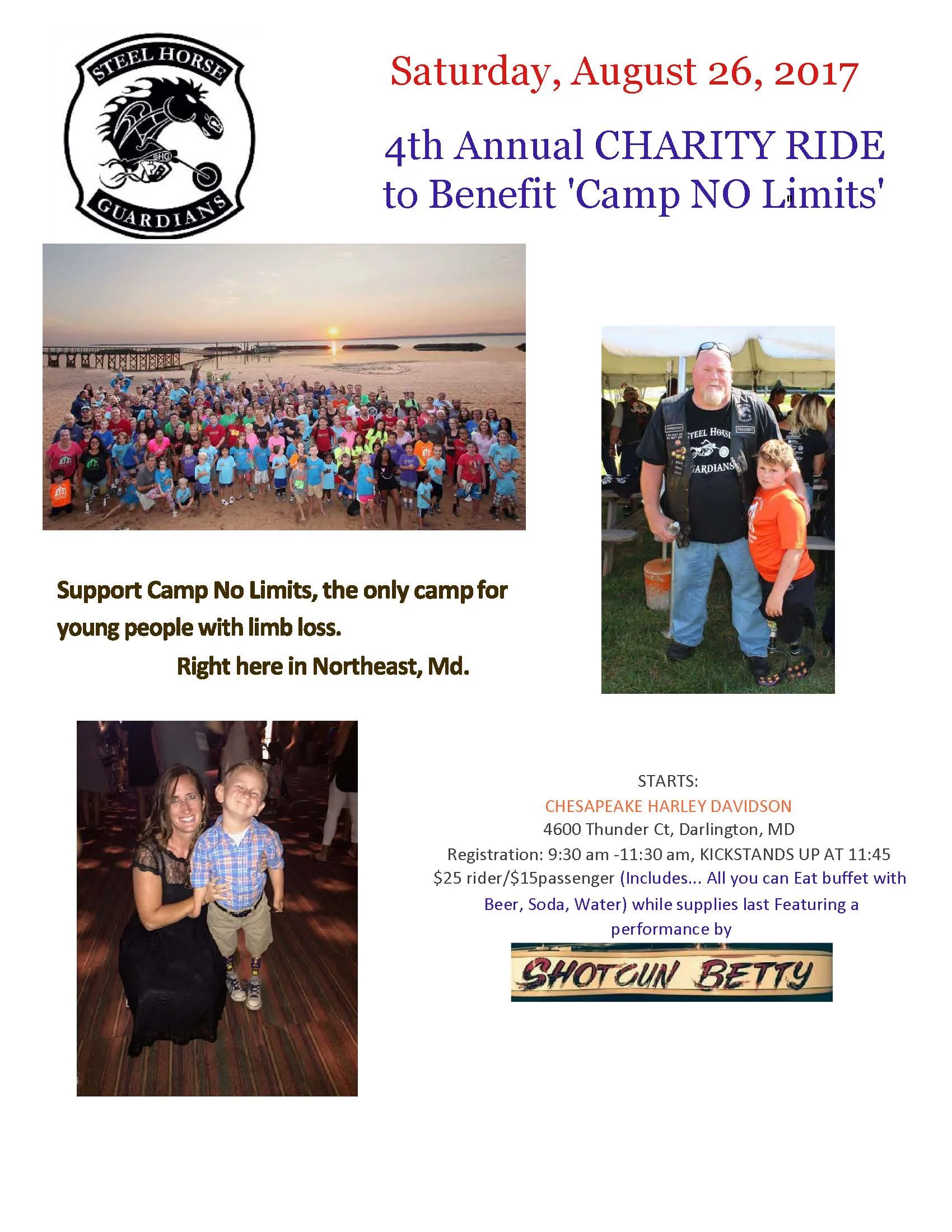 The Steel Horse Guardians are mounting up for their 4th Annual Charity Ride to benefit Camp No Limits. Camp No Limits is a camp for children and young people who are living with limb loss/difference. Camp No Limits has TEN locations all over the country, including one here in North East, Maryland at the NorthBay Adventure Camp!