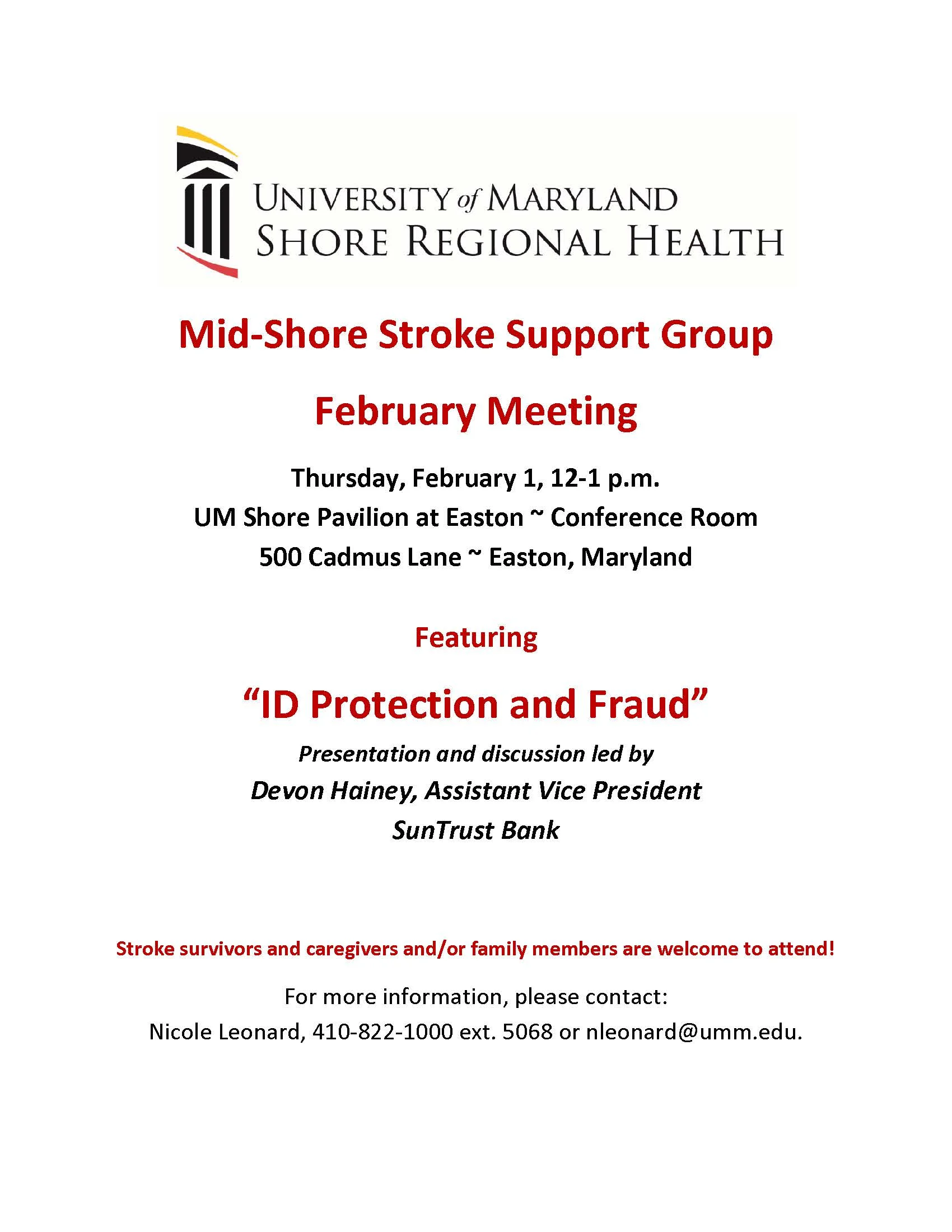 The Mid-Shore Stroke Support group, hosted by the University of Maryland's Shore Regional Health, will have it's February meeting on Thursday, February 1, 2018 from 12:00 pm - 1:00 pm. The group will meet in the Conference Room at the UM Shore Pavilion at Easton.