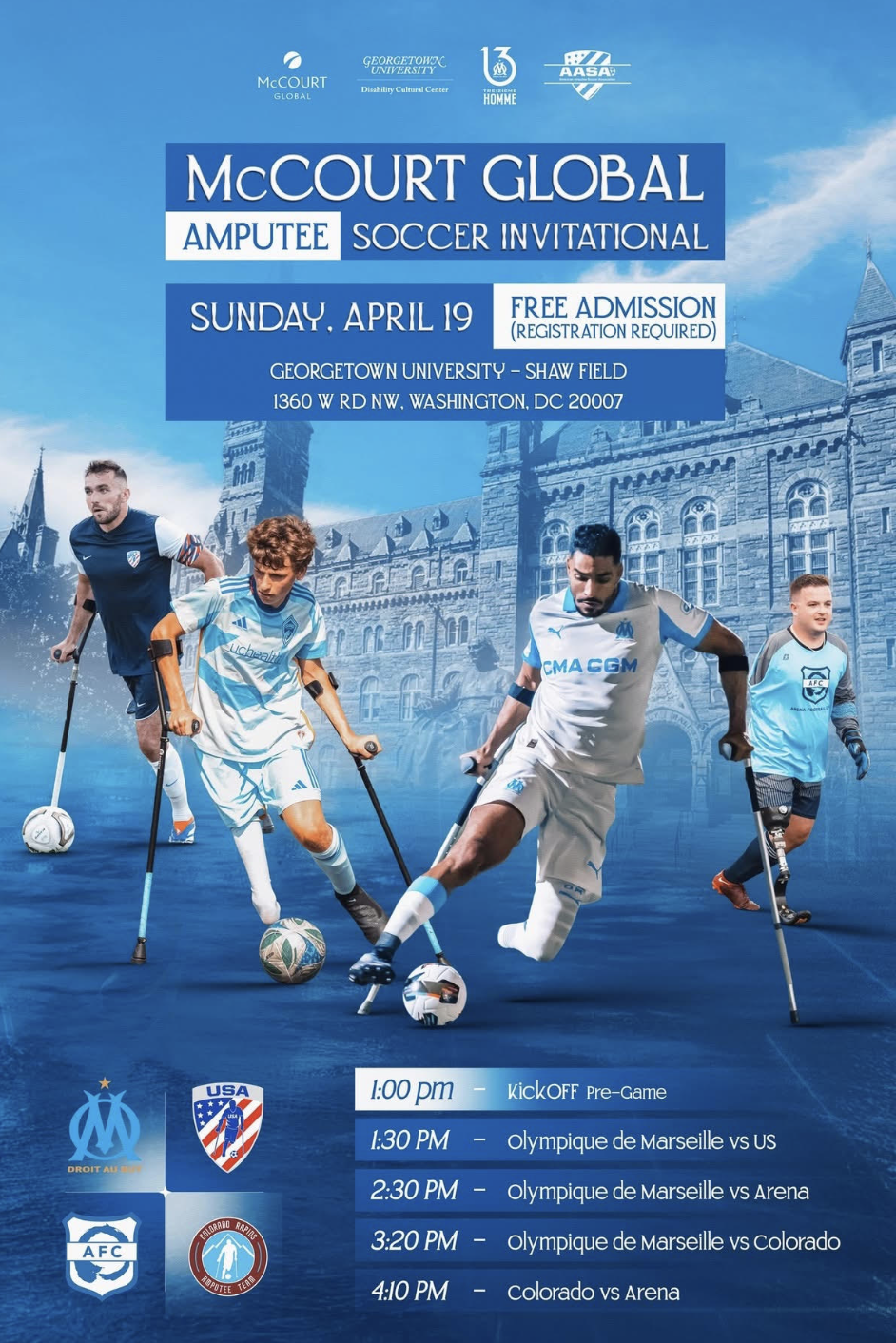 Join us for an afternoon of competition and inspiration at the McCourt Global Amputee Soccer Invitational! The inaugural McCourt Global Amputee Soccer Invitational comes to Georgetown University's Shaw Field on Sunday, April 19—bringing elite international amputee soccer to Washington, D.C. for the first time. Iconic French club Olympique de Marseille—the first in Ligue 1 to field an official amputee team—travels from the south of France to take on three American sides, including players from the U.S. Men's National Amputee Soccer Team program, the Colorado Rapids, and Arena Football Club, in a full afternoon of 7v7 competition. Fast, intense, physical, and extraordinary to watch, amputee soccer will surprise you. Come see it for yourself—we would love local individuals to come out and support/cheer on the teams!