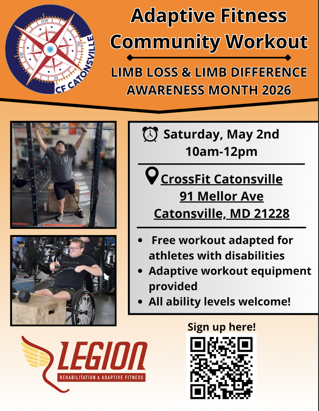 To celebrate the end of Limb Loss & Limb Difference Awareness Month, Legion Rehabilitation and Adaptive Fitness will be hosting a free adaptive workout at CrossFit Catonsville! This free event is geared towards individuals of all ability levels. This event is free, but registration is requested and can be completed here or by scanning the QR code on the flyer below!