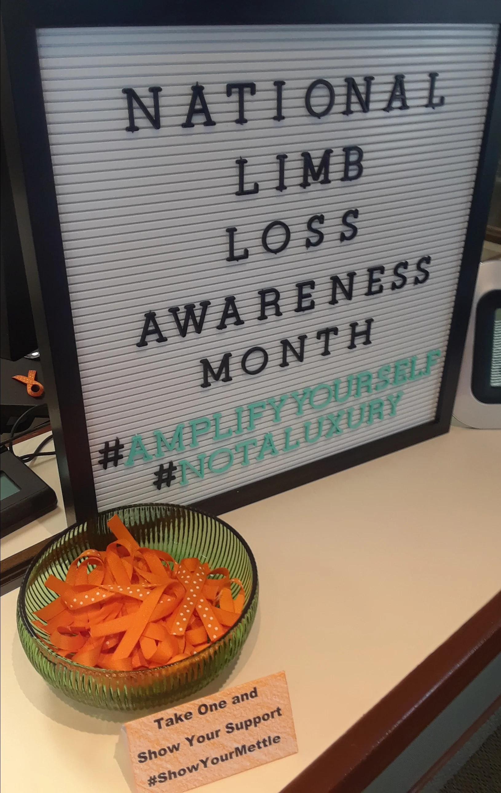 Every year, the Amputee Coalition (AC) nationally promotes April as Limb Loss Awareness Month, and holds a number of events. Dankmeyer has been so happy to help promote and participate in Limb Loss Awareness Month once again. This year, we went all out for all orange shirts on Wednesdays, with staff members wearing any flavor of orange shirt they might have (and some of those might have been Baltimore Orioles related). We made orange ribbons for office visitors to pick up and wear to show their support. We posted on Facebook and Instagram, and we were even featured in the Central Maryland Chamber of Commerce newsletter.