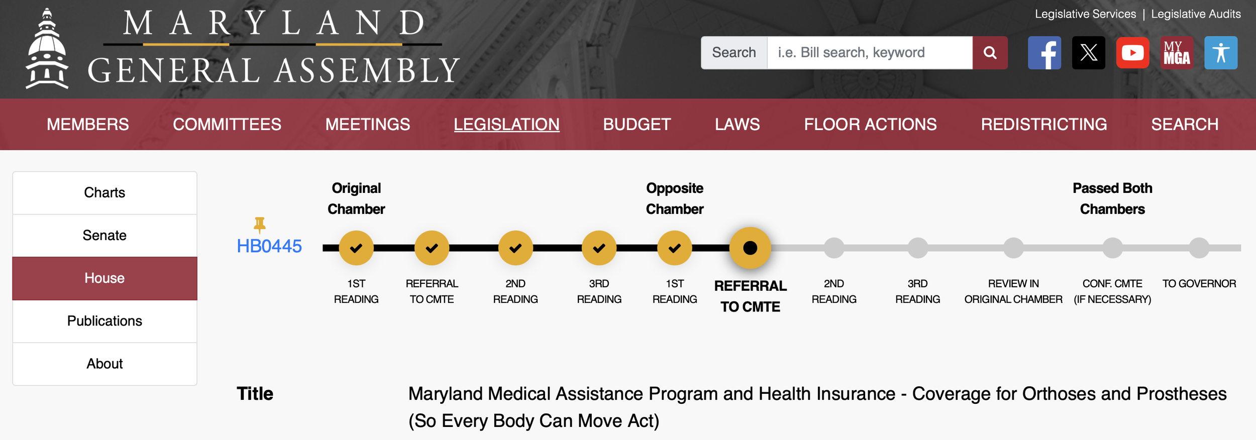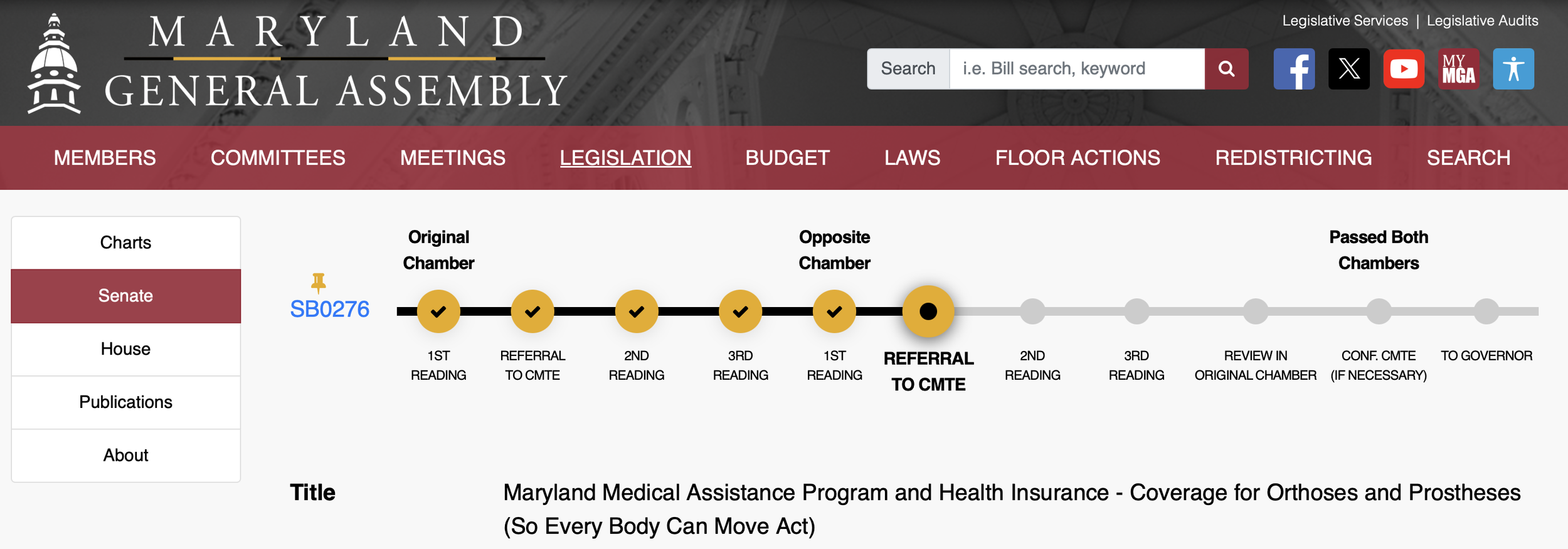 As many of you know, Maryland became the 6th state to pass legislation as part of the So Every BODY Can Move initiative during the 2024 Maryland Legislative Session. The law went into effect on January 1st, 2025 and it requires insurance companies that are regulated by Maryland laws to provide coverage for an additional prosthesis for physical activity when determined to be medically necessary by the individual’s care provider. This includes state commercial insurance plans, state employee insurance plans, and state Medicaid plans.