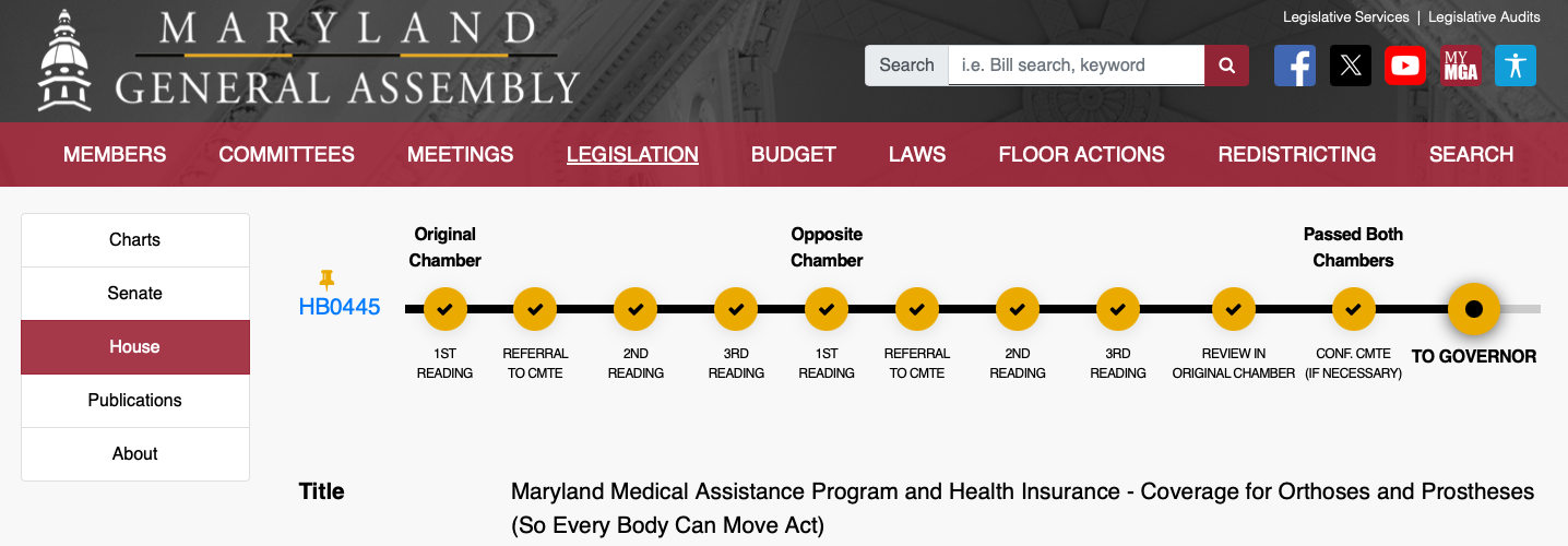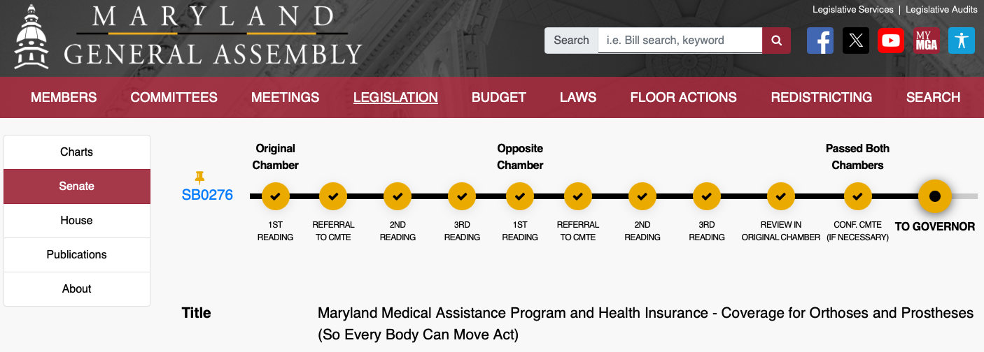 In Maryland, our first SEBCM law that went into effect on January 1st, 2025 requires insurance companies that are regulated by Maryland law to provide coverage for an additional prosthesis for physical activity when determined to be medically necessary by the individual’s care provider. This includes state commercial insurance plans, state employee insurance plans, and state Medicaid plans.